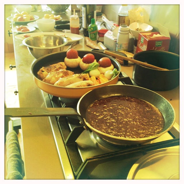 Chef Phillipe had pre-made a divine red wine reduction sauce to go over the chicken, and we stuffed mushrooms with tomatoes and sauteed baby carrots to accompany the chicken.