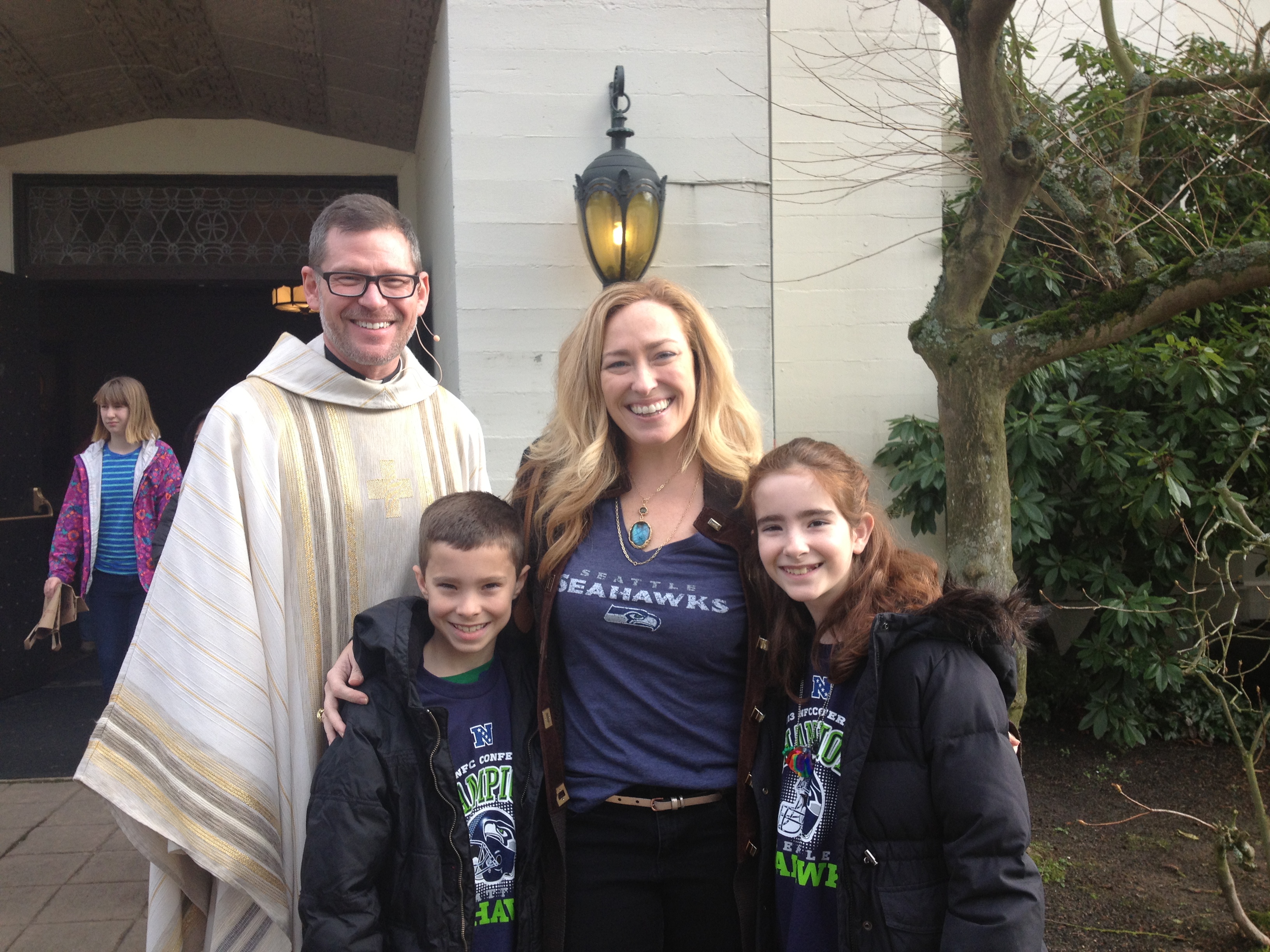 Father Glen with Bobby, Christina and Sophia Watt. Praying for a Hawks win!